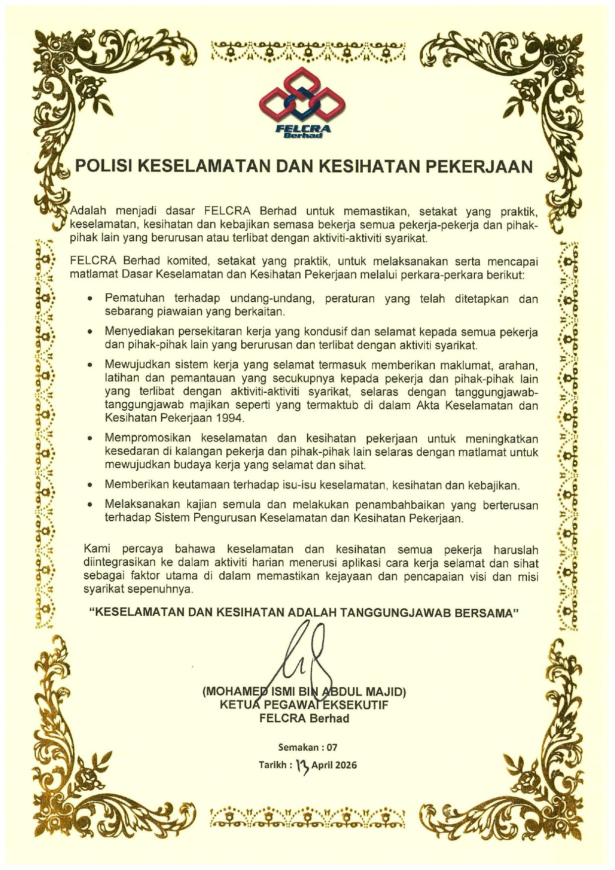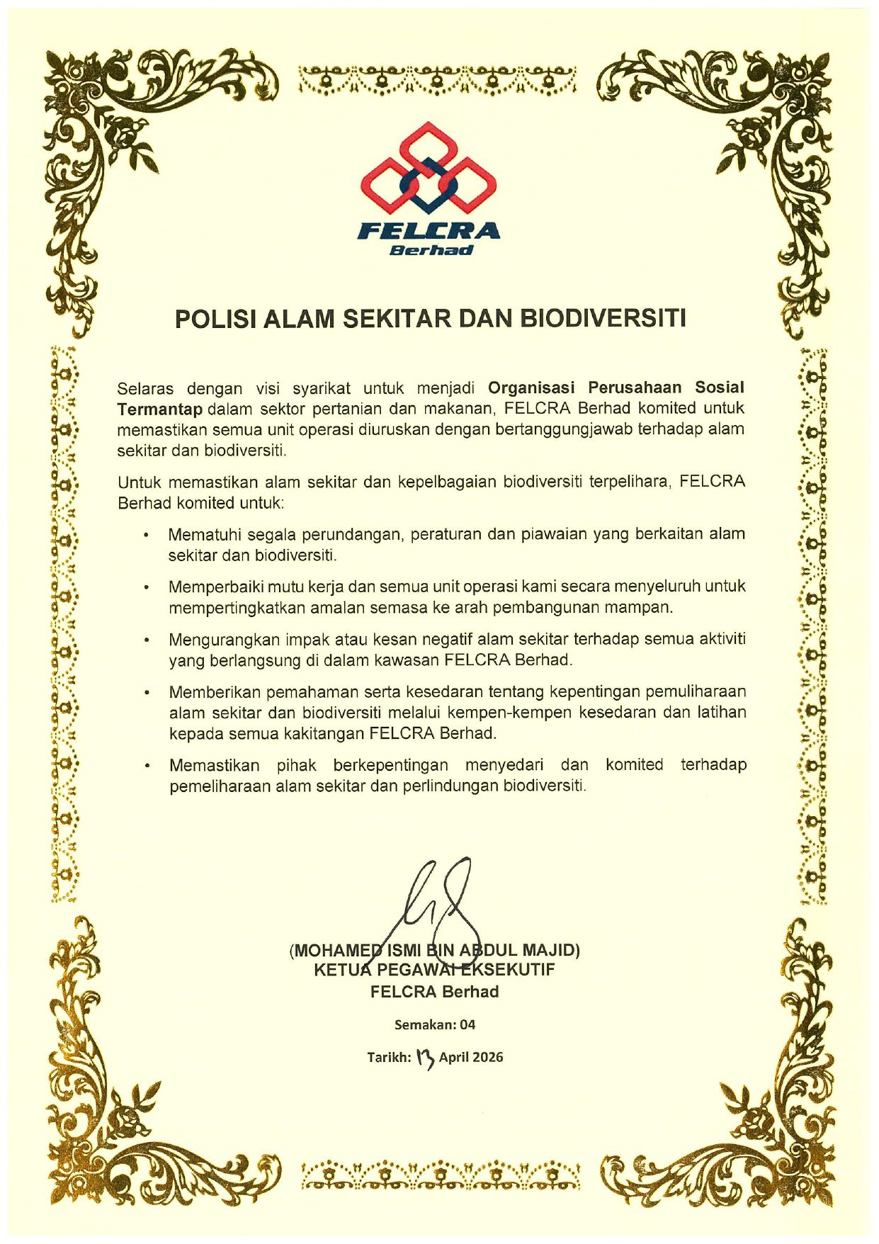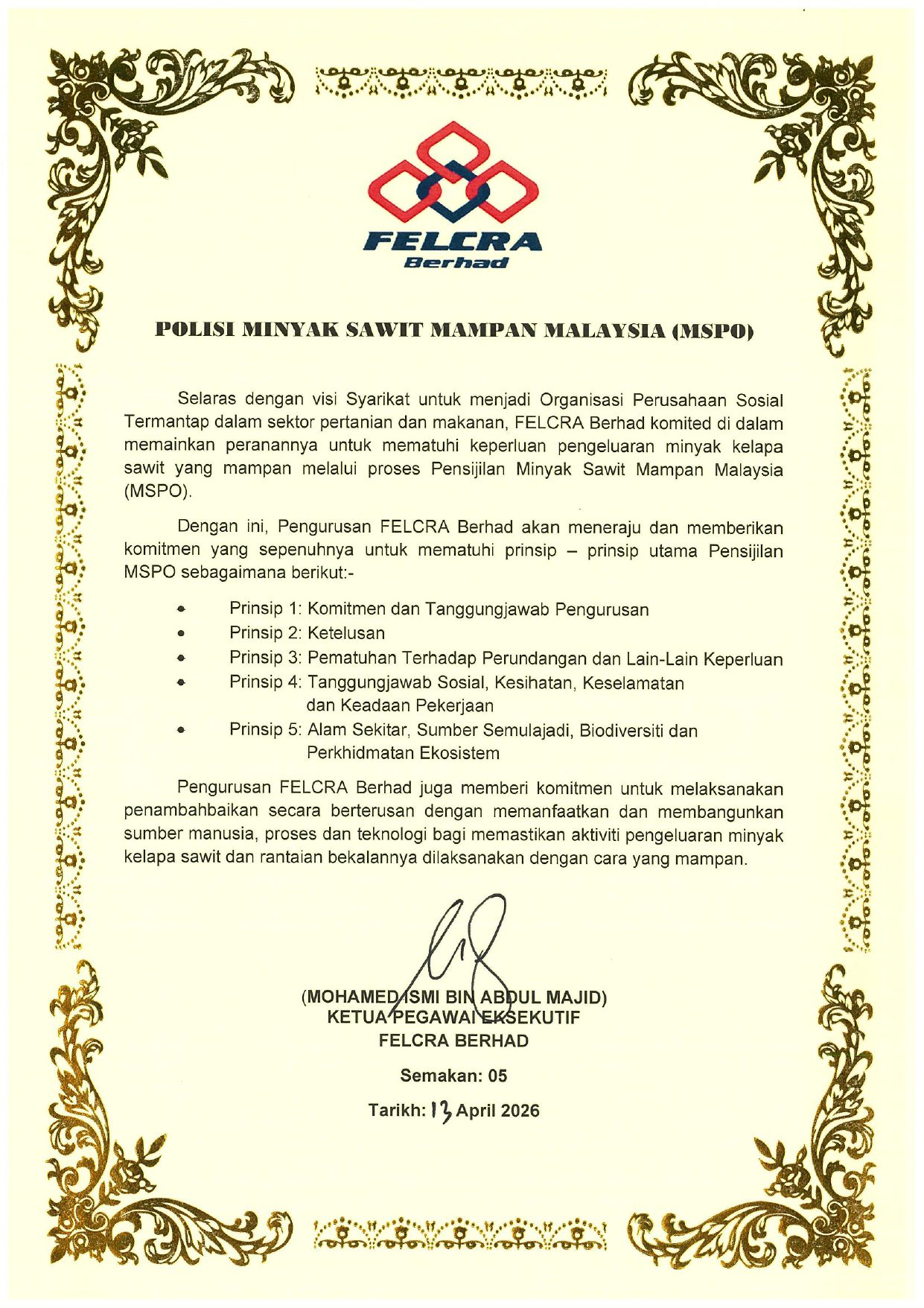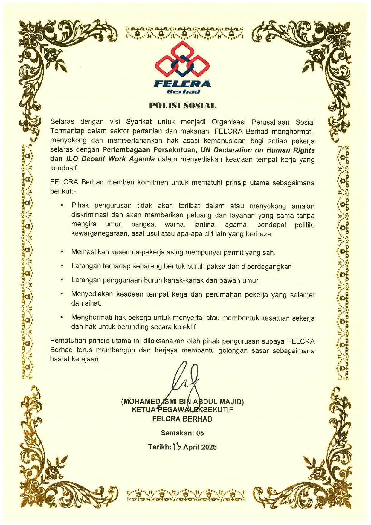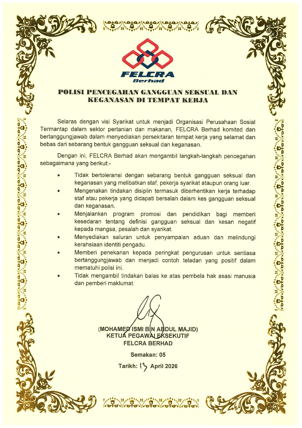Keselamatan dan Kesihatan Pekerjaan Minyak Sawit Mampan Alam Sekitar dan Biodiversiti Pencegahan Gangguan Seksual dan Keganasan Sosial